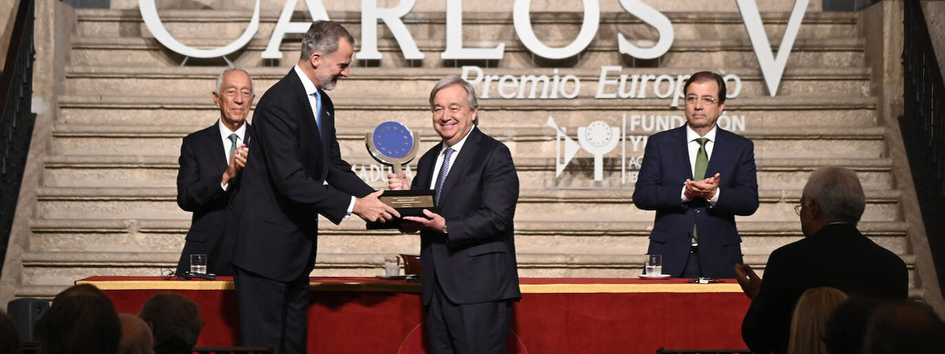El Rey Felipe VI entregó el Premio Europeo Carlos V a Antonio Guterres, por la promoción de una Europa más inclusiva, social, justa e igualitaria. El acto ocurrió en el real Monasterio de Yuste (Cáceres).